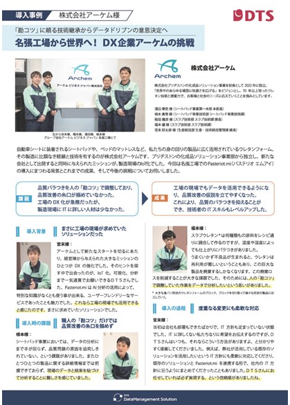 私たちの身の回りの製品に広く活用されているウレタンフォームの製造に、比類なき経験と技術を有するアーケム様。新会社として出発すると同時に与えられたミッションが製造現場のIoT化でした。今回は名張工場でのPasteriot.mi導入にまつわる背景と成果、今後の挑戦についてお伺いしました。